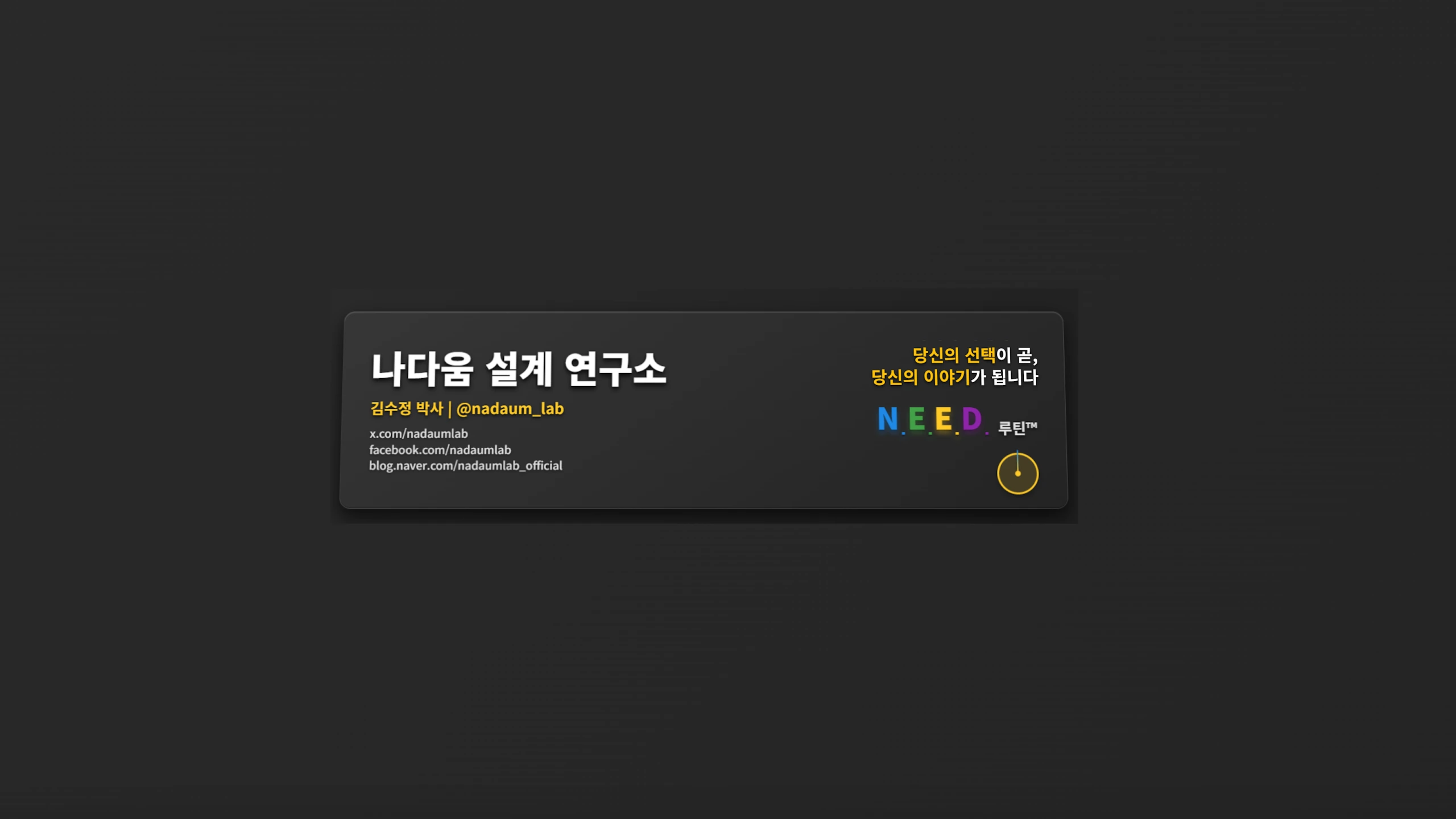 나다움 설계 연구소 | 김수정 박사 : 욕구 탐색부터 일상의 루틴 설계까지, 나를 설계하다 - 채널 소개 20여년간 자아 커뮤니케이션을 연구해 온 ‘나다움 설계’ 연구자의 채널입니다. 1. 우선가치 기반으로 흔들리지 않는 선택 기준을 만들도록 안내합니다. 2. 뇌과학 × 심리학 × 행동경제학을 커뮤니케이션학으로 통합한 N.E.E.D 4원칙 시스템을 제공합니다. 3. 감정과 외부 압력에 휘둘리지 않는 존재 기반 자기설계 방법론을 다룹니다. 전 휴스턴대, 인하대 연구교수 전 중앙대, 이화여대, 전남대 등 강의 경력 다수 국내 대학, 병원, 지자체 20년 이상 강의를 통한 N.E.E.D 시스템 검증 이런 분들께 추천합니다 ✓ 선택 기준이 없어 매번 흔들리는 분 ✓ 진짜 욕구를 모르겠어서 방향을 잃는 분 ✓ 과학적 근거 기반의 체계적인 자기설계 방법을 찾는 분 ✓ 몰입과 지속가능한 성장 루틴을 만들고 싶은 분 📌 키워드 #나다움설계연구소 #김수정박사 #존재기반자기설계 #우선가